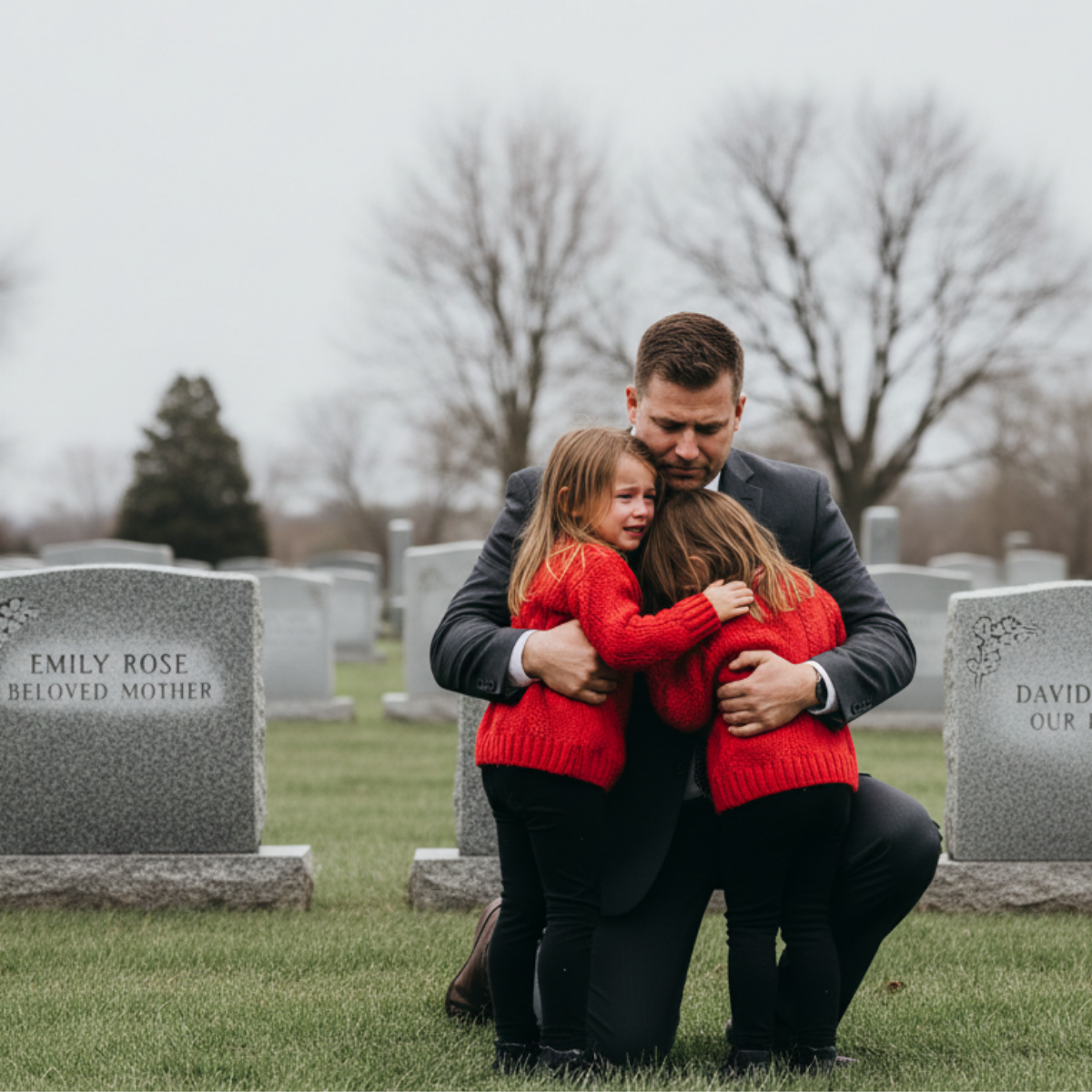 But it wasn’t the name on the grave that stopped him in his tracks. It was the two small figures kneeling beside it. He saw them from a distance at first, two little girls, maybe five years old, with matching brown hair pulled into low pigtails and wearing red sweaters that looked far too warm for the summer air.
